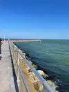 Man made beach. Gravel, does not compare to Padre Island or Florida. Great pier for sightseeing or fishing. Can walk in with no charge. Car drive in $10. No pets on beach. Small segment near museum with pets allowed and pier at this end as well.