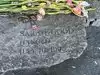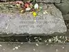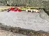 A simple pathway with a rock with individual names of victims on each stone. Surrounded by the cemetery. Tasteful, peaceful a nice place for reflection.