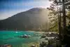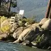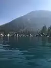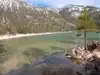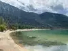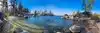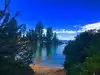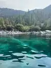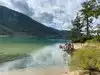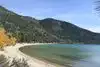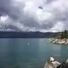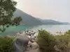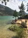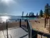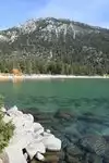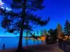 Surreal experience of laying on the beach while surrounded by the mountains and listening to the swaying pines. Nice bar and grill is present.