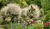 The display garden is like a fairy land with purple globes, colorful cones, pink trees, and spikey spherical trees. It's full of colors and shapes, lawn ornaments, and pastel benches. It's worth the visit during the May bloom.