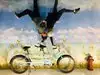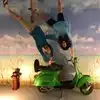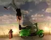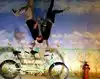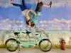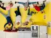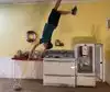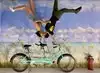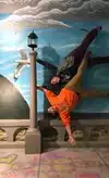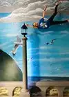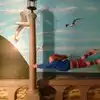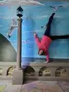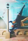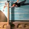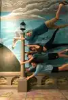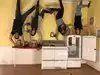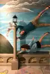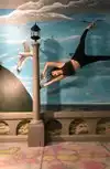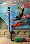 It's a photo shoot of silly perspective photos where you pose reaching out to an object painted on the wall or ceiling, or hold onto a physical prop and then pose with silly facial expressions like you're falling or screaming. Later, you rotate the photos so that it looks like you're falling from the ceiling or being blown sideways by the wind, etc.