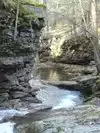 Just on the south side of Wilkes Barre. Trail goes both uphill and down along two joining streams. Going up from the nice walking bridge over the stream is more strenuous/rocky and can be a bit hazardous when wet. Trail can be slippery and could be a 30+ foot drop into the water. Nice if dry. Several nice waterfalls / erosional "Tubs" along the upstream route.