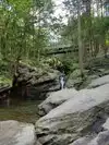 Easy walk to from parking lot about 100yrds. The falls are at the beginning of the trail. The shallow side to the right of the bridge is usually loaded with little kids. There is another swimming hole to the left of the bridge for older people. You can hike the trial at the bottom of parking lot to the right, easy flat, or you can do the loop which follows the river and then cuts across the top of the mountain and comes back down to the parking lot! Summer weekends are crowded and parking maybe full, fall and winter are nice and less crowded. The falls freeze over creating a nice photo opportunity without a long walk!