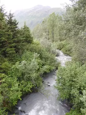 Upon leaving Anchorage you almost immediately encounter coastal drive along the Turnagain Arm (part of the Cook Inlet). Several turnouts exist to take pictures of the mountains and glaciers across the Turnagain Arm. One of the picturesque things about Alaska is that there seems to be mountains and glaciers everywhere you look. Perhaps 30 miles out of Anchorage you will cross a fishing creek with several fishermen and perhaps a Bald Eagle, or two, waiting for their discards.