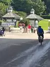 In the archway, push a button to get a ticket.