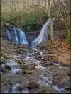 Soco Falls is a hidden treasure right off the highway, west of Maggie Valley. Traveling from Maggie to Cherokee, it is located on the left and is not very well identified. Small parking area is only clue it exists. From the parking lot a short, but somewhat treacherous hick down to the falls is rewarded by a beautiful and unique dual water fall.