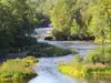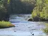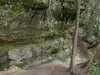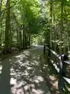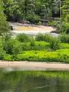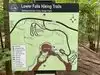 You can hike the trail to the Lower Falls starting by campsite 125 and to the right towards sign "16". It is a nice wooded and sandy trail. Walk .3 miles to the "16" sign, then another .3 miles to the left to the "13" sign. Walk along the boardwalk and when it ends, you can cross the river to the island - it is only knee deep at it's deepest. Don't pay for a row boat, walking across is just as easy. We walked through the river a little before getting on the island and hiking that trail. Kids were swimming in the water all around the island. Then we hiked towards sign "14" by the bathrooms and took the trail towards "15" and walked right back to near site 125. (.7 miles) The total hike was very sandy and full of pine needles, lots of stairs, but we never saw any nature- animals.