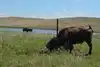 During our second visit in June, 2017, a lone bull again met us at the south entrance. We again drove miles without seeing other bison. (We did see some cattle.) But the visitor's center was open. We learned about the "Bison Loop" and heard where bison had been grazing a few hours earlier. This information led us to three groups spread across the hillside. Success!