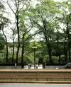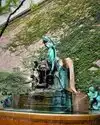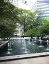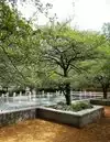 AIC South Garden is a true masterpiece, designed by a famous landscape architect Dan Kiley, and built in 1962--1967. As a grid-structure garden, South Garden is a striking example of regular geometry. The unforgettable centerpiece sculpture Fountain of the Great Lakes (1907- 1913) is a grand artwork by a world-renowned landscape architect Lorado Taft. The large bronze sculpture depicts five women, symbolizing the 5 Great Lakes. The sculpture is flanked by Sargent crabapple trees, and in front of it there's a pool of water with a grid of low jets. At the sides of the pool, in the raised planters with marble edges, there are sixteen hawthorn trees, their branches forming a dense overhead canopy. There are benches for visitors to relax and enjoy the whole scenery. The huge honey locust trees at the entrance to the garden also screen the garden from the busy South Michigan Avenue.