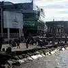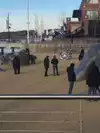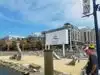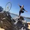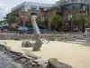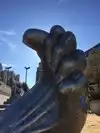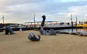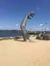 A huge sculpture of a drowning (?) man. The area is covered in sand and is close to the water, so it gives it a beach feel. Kids can play in the sand and climb the sculpture. There are stores and restaurants that surround this area. It is clean and safe. Fun family-friendly area.