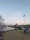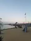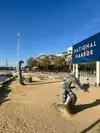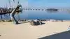 Unique sculpture rising out of the sand. Good place for kids to burn some energy too! Sandy covered waterfront area with seating area.