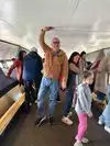 The person who gives the speech to your group going up, will properly assess who rides with who on the way up and down (same group). If you have a family greater than 5, you will be divided. Very small kids can ride on an adult's lap. I forget exactly the age of child which they allow to do this.