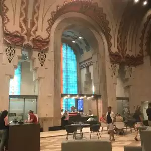 Lobby is magnificent - so much color and detail in ceilings and walls. Now offers area for a drink or small bites while soaking up this grand old beauty. Well worth popping in when visiting the revitalizing Downtown Detroit.
