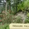 Treasure Falls can be seen from the road, but it is much better (especially for the driver, who should be watching the road) to pull over and hike to the falls. Just be careful pulling back out onto the highway. There are always people who think they know a better way to get somewhere than the people who built the path, or think they can get a better view. However, making your own trails causes erosion, usually takes longer, and is more difficult than the designated route, That is the case here. Stay to the left to avoid a lot of wasted effort and frustration. Even on the left, put the baby in the backpack as this is no place for strollers or wheelchairs.