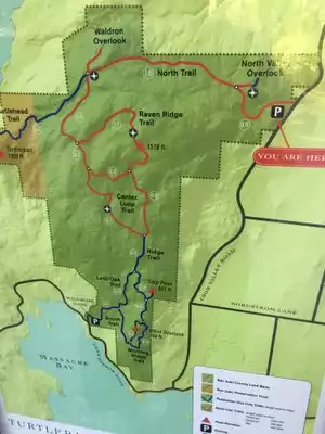 It is a little hard to get information about the trails--the pdf on their website seems to be missing elements that should be on the legend. Specifically, the triangles represent key elevation marks, and therefore, likely the best views. (it appears that the best viewpoints might be Turtlehead (1005 ft) and Raven Ridge (1519 ft).