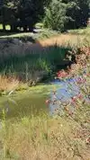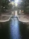 Currently, in August of 2016, the upper half of the waterway is empty as upgrades are being done, apparently adding a weir so that there is more movement of water. The water usually has a bright green sheet of what I think is algae of some kind, which is apparently a normal part of a healthy pond environment. However, I believe the upgrades are meant to reduce this.
