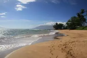 There is good snorkelling here around the north end rocks. A beautiful , 1,500 ft or so stretch of golden, soft sandy beach with good entries. Great place for families with children to frolic in the surf and boogieboard and swim. A good beginners diving area offshore here. Parking is tight at times as shared with three beaches, so get there early. Lovely views here of the turquoise ocean, offshore islands, lava outcrops and sunsets. Highly recommend this gorgeous beach in the Wailea area.