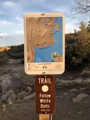 My husband and I went to Watson Lake with the intention of walking/hiking around the lake. Following the white dots was very difficult since many of them were not easily recognizable. I'm sure with the amount of rain that Prescott has had, that many got washed away or faded. The terrain was more difficult that I had expected. I wouldn't recommend it for people unless you want an obstacle course. The lake is beautiful. You'd be better off going kayaking.