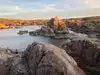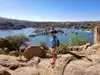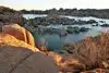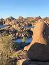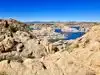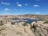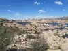 If you're physically fit, take the loop trail all the way around the lake (we went counter-clockwise, traversing the flat section first). Simply stunning views of the lake and the ancient, oddly shaped boulders, many of which one must scramble over. Highly recommended. Well marked with signs and white marks, which are more important than you might think, since there are options along the loop, and much of the trail is over boulders. Took us 3 hours. Carried 2 bottles of ordinary-sized water each, and ran out at the end. Be sure to take at least that much water. AZ is not only hot but dry.