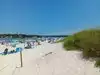 This is a nice wide beach with soft sand and then really hard sand as the tide goes out. It is a nice place to take the family for a day at the beach. The waves are good and there is plenty of space to settle in.At low tide there is a sandbar that you can walk to the little island just on the left of the beach...but be careful that the tide doesnt come in and leave you stranded there! There is a little snack bar too just at the beach walkover entrance. There is a pretty hefty parking fee but worth it for the day.