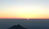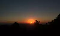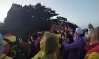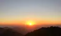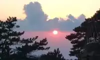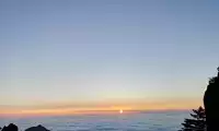 Many people have gathered on the flat open space on the top of the mountain. To watch the sunrise, everyone wrapped themselves in whatever they could wear, down jackets with shorts, hotel towels became wrap skirts, and some people even put quilts on themselves. They all tried their best to watch the sunrise. The sky was particularly clear, with a thin crescent moon hanging in the sky, and the rising and setting of the sun and the moon appeared in the same lens. There was a straight dividing line between the sea of clouds and the sky, and everyone stared at the brightest point. It got brighter, brighter, and brighter. The sun poked its head out on time at 5:07 as predicted, not from the back of the sea of clouds but from the middle. It was red like a soft egg yolk, and like a red balloon. Don't look around, and don't just take pictures. There is still a big difference between what you see in the lens and what you see in reality. The round red ball broke free from the entanglement of clouds and mist little by little, and people held their breath, as if they were expecting the birth of a new life. The red ball finally jumped out of the sea of clouds. Because the air was clean, the sky was bright and the sun was shining through the clouds. The strange peaks and rocks that were hiding behind the clouds yesterday were suddenly covered with colorful clothes and magnificent. The sea of clouds in the distance was rolling, and it really felt like riding the clouds and flying like a crane!
