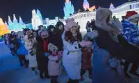 People queue up under the ice slide at the Ice and Snow World