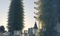 As night falls and the lights come on, we journey into the romantic Snow Town, a beautiful place reaching into the clouds. There's even a statue of Buddha on top of the snow sculptures. If the surrounding fog were thicker, you'd think you were in the Sky Palace. Can you make out any of the buildings inside? I only recognize a few. There's the pagoda of Li Jing, the Heavenly King of the Pagoda, and the ancient Roman Colosseum.