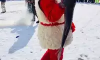The fisherman, wearing a white sheepskin coat and a wide leather belt around his waist, is about to start the ice fishing show for us.
