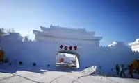 The gatehouse carved from snow is magnificent, and paired with the clean blue sky, it is beautiful.