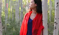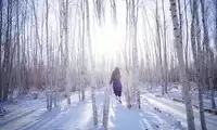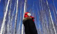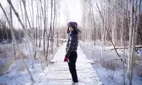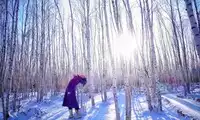Driving along the northernmost forest farm, you can see densely packed pine trees with black branches on both sides of the road. Occasionally, you can see the silhouette of a white birch tree, with white trunks standing upright in clusters on the snow, which looks very strange. But it is far from enough to see it this way. Only when you enter the birch forest and see a whole area of white birch trees, the blue sky is illuminated especially refreshingly. The beautiful girl wearing a red shawl and half-covered face can't resist the temptation of the black eyeballs.