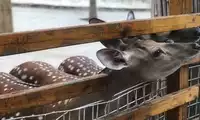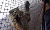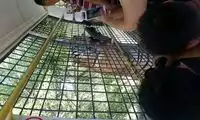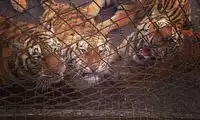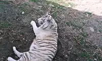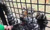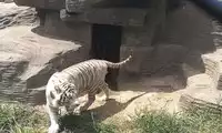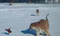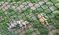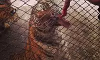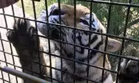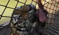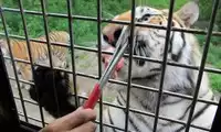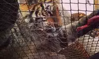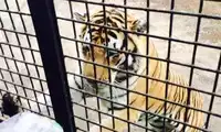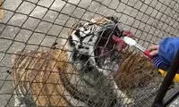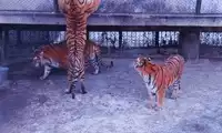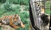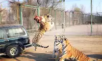The others in the car pooled their money to buy a live chicken, and then they changed the venue to watch the tiger's predation. This time, the chicken dodged left and right, giving the tiger a hard time. Finally, when the victorious tiger reached over to pluck the chicken's feathers, the chicken nearly escaped, causing another commotion among the surrounding tigers.