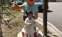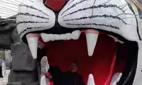 The tiger sculpture outside is very cartoon-like, with a model of a tiger's mouth. Many children are taking pictures in the tiger's mouth.