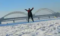 The Songhua River Railway Bridge is Harbin's first cross-river bridge. It was nearly dusk when we arrived, the setting sun bathing the river in its afterglow. Several couples were taking photos on the bridge. The bride, wearing a strapless wedding dress, wore a beaming smile despite the cold breeze. After they left, I ran to their photo booth and struck a few poses myself, but I didn't quite get the "blockbuster" look I'd hoped for.