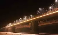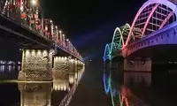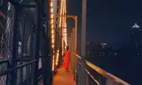 The railway bridge at night is unique. There are people singing and dancing around. It is beautiful to walk along the road and watch the night view.