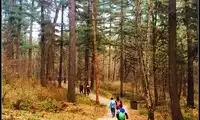 The five-hour hike through this forest park, primarily red pine forest, was filled with the occasional appearance of adorable chipmunks and the sound of a gurgling stream. Although the sun was shining, the temperature was pleasant. Bring your own lunch; there aren't many restaurants in the park. The hike wasn't tiring; there wasn't much climbing involved, so it was mostly walking.