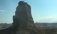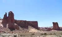 This is a dry riverbed surrounded by rolling hills. Due to the lack of rainfall, there is little vegetation. Within the scenic area, numerous red rock pillars and stone walls stand tall, creating a striking visual impact under the sunlight.