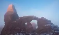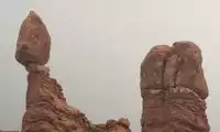 The window area is not far from the park entrance, so it's recommended for watching the sunrise. It also offers great photo opportunities. The trail here has a minimal climb, is short, and has a low difficulty level, making it very accessible. I really wanted to catch the sunrise early in the morning! Unfortunately, the sky wasn't kind, and the thick fog cast a shadow over my mood. I wiped my glasses vigorously, and then I realized the iconic Balancing Rock was right in front of me.
