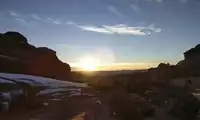Sunset is the most beautiful. We went to Arch Park to check it out. The park was closed, and they told us to drive straight ahead. It was very user-friendly. We picked up a guide to the park. Halfway up the mountain, it started pouring rain on the broken road. We were so excited. We got in the car and continued our journey through the arch. The rain made the rocks even redder, which was quite stunning. It felt a bit like the Flaming Mountains. Much of the ground was green, which was salt from the seabed.