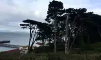 Afterwards, we went to a viewing point on the other side of the bridge to admire the Golden Gate Bridge from a different angle. The sun was out, but the bridge was shrouded in a thick layer of fog. I could only see the lowest part of the bridge, so I couldn't take a satisfactory photo of the Golden Gate Bridge. However, the nearby seascape was beautiful. The difference between the photos taken with and without the sun was huge.