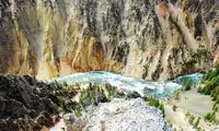 The center of Yellowstone National Park is the Grand Canyon of the Yellowstone, one of the park's most famous attractions. Visitors can admire the magnificent, deep canyon scenery and cascading waterfalls. On clear days, a rainbow can be seen across the canyon. The Yellowstone Canyon is 32 kilometers long, 450-1,200 meters wide, and up to 360 meters deep. Long-term river erosion has shaped the rock walls into vibrant colors of yellow, orange, brown, and tan, earning the Native Americans the name "Yellowstone."