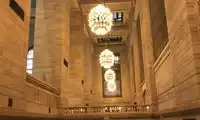 Grand Central Terminal opened on February 2, 1913, constructed with a massive expanse of granite. Its interior concourse is magnificent and captivating, stretching 275 feet. It has appeared in numerous films, including Madagascar, The Avengers, Superman, and X-Men. The ceiling of Grand Central Terminal is decorated with the zodiac signs. While beautiful, it contains numerous astronomical errors. Perhaps Grand Central's most iconic feature is the four-faced clock in the center of the concourse. Constructed of brass, its dial is made of precious opal. It's said to be worth well over $10 million! Why bother robbing a bank? Take this home and you'll be rich! Beneath the clock is a popular meeting place for many New Yorkers. Furthermore, the time displayed on the clock is actually one minute ahead of the actual time, preventing people from being late and missing their trains. I thought to myself, with someone like me who has no sense of time, even ten minutes ahead wouldn't guarantee it. Another attraction in the concourse is the beautiful 24-karat gold-plated chandeliers, each containing 110 bulbs.