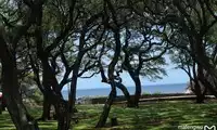 We arrived after a slow, 20-minute drive along the coast. A long line of cars formed at the entrance, but it was quiet and orderly. Parking was $1 per car, free for up to 15 minutes. Travelogues had suggested limited parking, but the parking lot was quite large, with space for several hundred cars. Since we weren't snorkeling today, we didn't pay the $7.50 per person fee to access the beach below. However, the azure bay offered a clear view of the coral reef, and many snorkelers were snorkeling. The golden sands were stunning, and the hills surrounding the bay resembled a crouching dinosaur, its head and claws clearly visible. Returning to the parking lot, we encountered an elderly man humming a beautiful song softly to a guitar under a tree in the sunshine. The scene was truly beautiful.