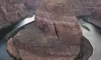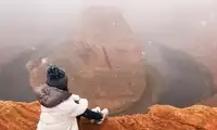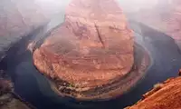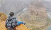 The Colorado River, like a turquoise silk ribbon, twists and turns gracefully through the canyon. It happens to make a sharp 180-degree turn here, forming a U-shaped channel resembling a horseshoe, hence the name. The canyon is so deep that it's difficult to see if the water is flowing. Curious individuals often bravely step over the guardrails and walk to the ledge to explore. The morning mist still shrouds this section of the river, making the view dizzying even from a distance. The cliff edge offers a perfect photo spot, capturing the entire Horseshoe Bend. Although it's not crowded, you have to wait for those in front of you to finish posing.