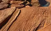 The most common red sandstone is located around Horseshoe Bend, which appears dark red under the sunlight, while the canyon is filled with turquoise river water.