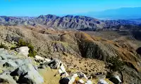 Following the park road, we soon arrived at the Quail Springs Picnic Area. Parking spaces were marked around a small pile of boulders. This served as a picnic area with a few tables and restrooms, and also marked the beginning of the Quail Springs Trail. The temperature wasn't too high today, and the sun was setting. We disembarked, climbed some rocks, and took photos of the unusually shaped trees. After a half-hour stroll without feeling the heat, we hurried to Keys View, the park's highest point at 1,580 meters. While it's called a high point, it's only a couple hundred to three hundred meters higher than our previous stops. However, from this expansive southwest view, we could see not only Southern California's two 3,000-meter-high peaks and the sweeping mountain ridges in the distance, but also a vast basin tens of meters below sea level nearby. This 3,000-meter drop, combined with the vast, desolate scenery, devoid of birds or animals, which seemed unchanging for eternity, made us contemplate the courage of the pioneers who established their roots here. The weather was not very good today, so we only saw this much. If it were a day with high transparency, it is said that you could use a telescope to see the Mexican mountains 150 kilometers away.