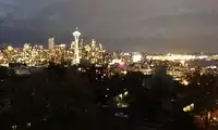 We were at Queen Anne Hill, a great spot for viewing downtown Seattle. There were many beautiful, old houses on the hill, and no entrance fee was required; you could drive up. Kerry Park, a small observation deck, offered a breathtaking view of the city at night. The area was surrounded by residents, so the view was very pleasant.