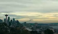 After getting off the bus, it's a short walk to the park at the top of the mountain. There are many people sitting there enjoying the view. The skyscrapers and the Space Needle form a perfect silhouette in the distance, while the snow-capped Mount Rainier in the distance reveals its majestic form beneath the clouds.