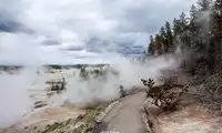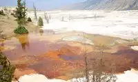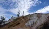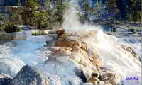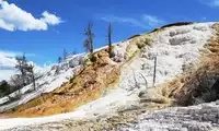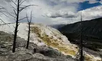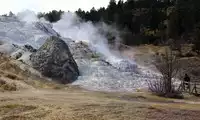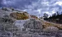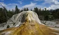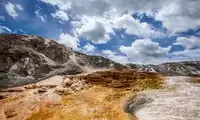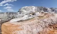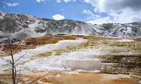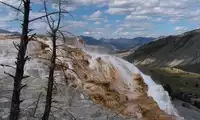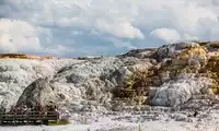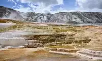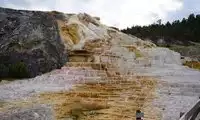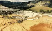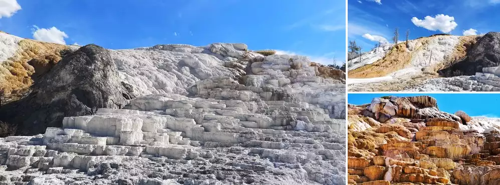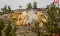Mammoth Hot Springs is located in the northwest of Yellowstone National Park, close to the park's north entrance. It consists of two sections, the middle section, which houses the main scenic area. The scenic area is quite large, and the hot springs still erupt, but they are now smaller in size and height, giving the impression of being on the verge of exhaustion. However, the remaining scenery is still breathtaking, and one can imagine how spectacular the geothermal activity here was before 2002. It was the world's largest known carbonate hot spring. The landscape is dominated by limestone steps. Mammoth Hot Springs draws its water from the Norris Geyser Basin, reaching temperatures of up to 77°C. Back then, algae thrived in the hot springs, giving them a vibrant color palette of brown, orange, red, and green—a truly dazzling sight. However, after a tectonic shift in 2002, most of the hot springs ceased activity. The large number of microorganisms that died out caused the springs to lose their color, now predominantly brown and white.