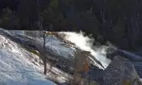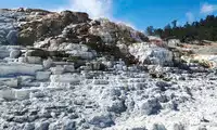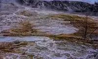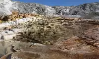From a distance, Mammoth Hot Springs resembles a glittering, crystal-clear mass of gold and jade. The hot springs form a series of beautiful, multicolored steps along the hillside. This area is the only tourist accommodation in Yellowstone National Park accessible by car in winter.