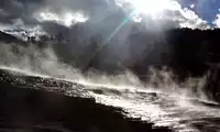 Yellowstone National Park is rich in geothermal energy, with boiling magma 8 kilometers below the surface. Even wearing a windbreaker, we felt the surging heat beneath our feet as we walked along the boardwalk. If your hat or scarf blows off, don't try to pick it up; you could lose your life if you step on it and fall.